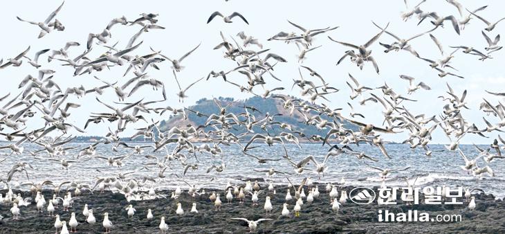 5일 제주시 한림읍 수원리 해안가 갯바위에서 휴식하던 갈매기들이 강한 바람을 맞으며 날아오르고 있다. 강희만기자