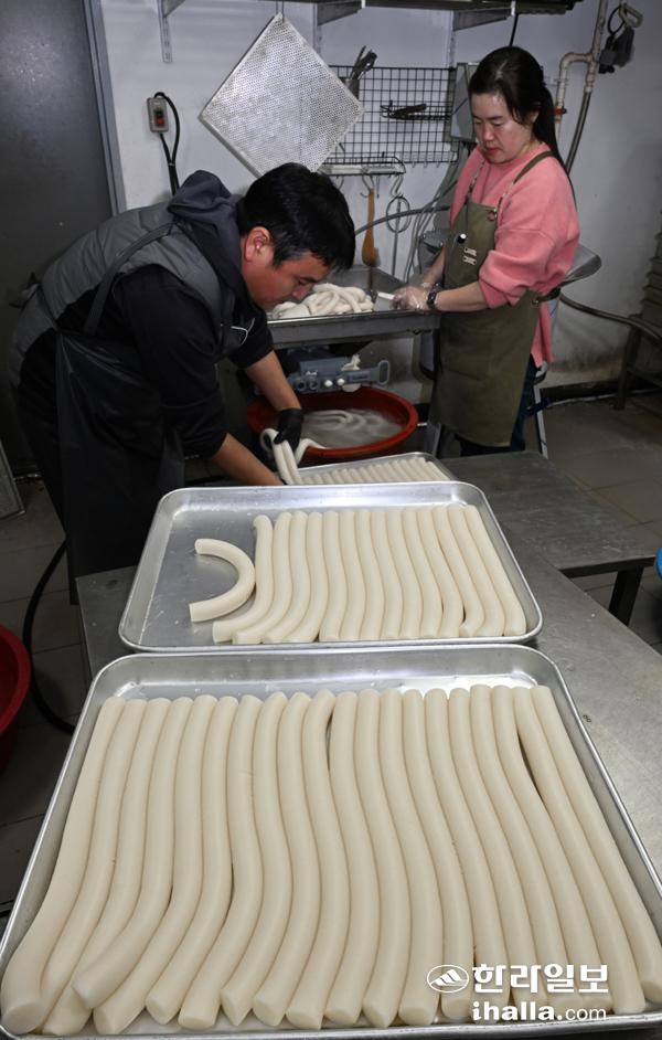 민족 고유명절인 설을 나흘 앞둔 6일 제주시 노형동 한 떡방앗간에서 가래떡을 뽑고 있다. 강희만기자