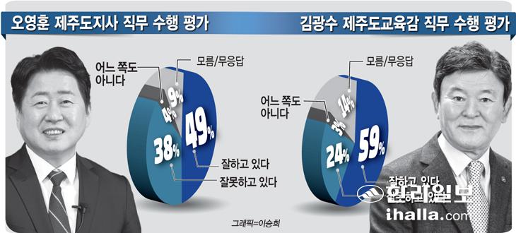 도민 49%는 오영훈 도지사의 직무 수행을 '잘하고 있다'고 평가했고, 59%의 도민은 김광수 도교육감의 직무 수행을 '잘하고 있다'고 평가했다.