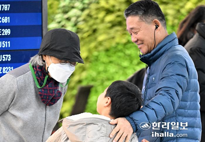 8일 제주국제공항 도착 대합실에서 오랜만에 손자를 마주하는 할아버지와 할머니의 얼굴에 웃음이 가득하다. 강희만 기자