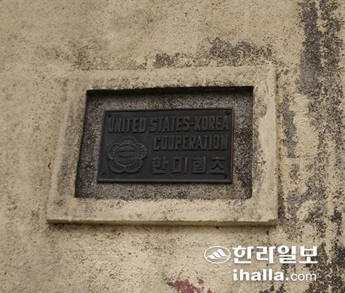 옛 상천분교 건물 외벽에 남아 있는 '한미협조' 현판.