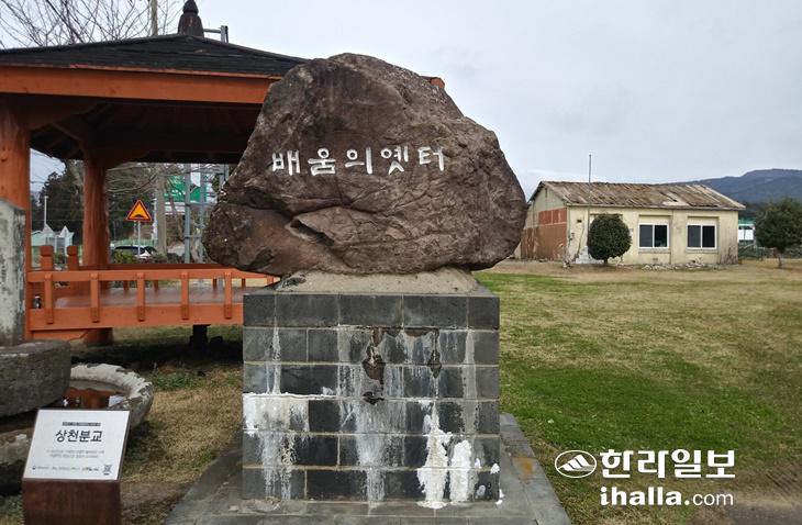 서귀포시 안덕면 옛 상천분교 입구 '배움의 옛터' 표석 너머로 교실이 있던 학교 건물이 보인다. 진선희기자