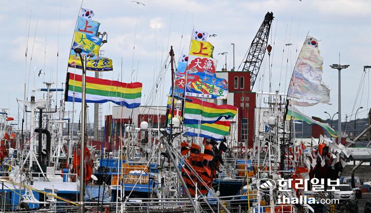 11일 서귀포시 성산항에 정박한 어선에 어업인 무사안녕과 풍어를 기원하는 만선기가 펄럭이고 있다. 강희만기자