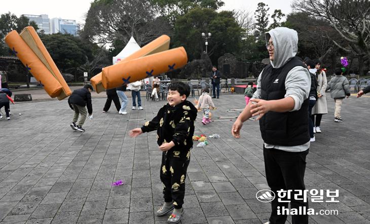 설 연휴인 11일 제주도민속자연사박물관을 찾은 아버지와 아들이 윷놀이를 즐기고 있다. 강희만기자
