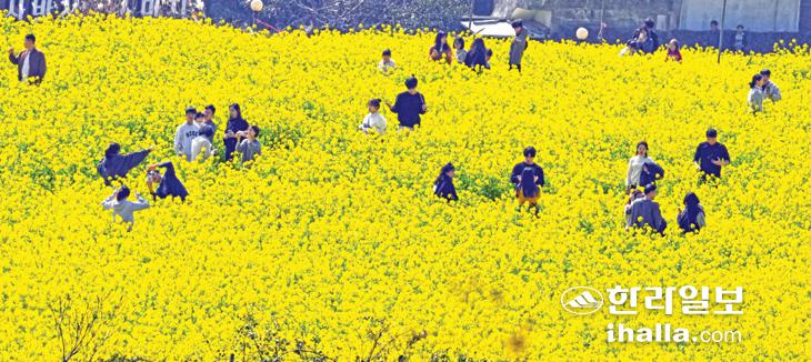 20℃에 육박하는 포근한 기온을 보인 13일 서귀포시 안덕면 사계리 유채밭에 많은 관광객들이 찾아 사진을 찍으며 제주의 겨울 정취를 만끽하고 있다. 강희만기자