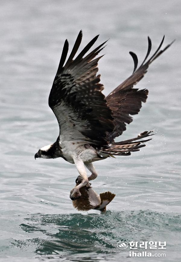 14일 제주시 한경면 금등리 해안에서 물수리 한마리가 광어를 낚아채 날아가고 있다. 강희만기자