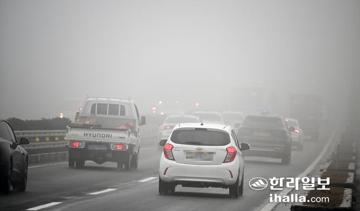 비가 내린 15일 오전 평화로 일대에 짙은 안개가 끼자 차량들이 서행하고 있다. 강희만기자