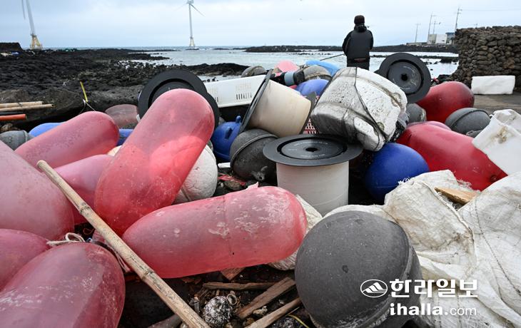 15일 제주시 한경면 금등리 해안가에 해양쓰레기들이 쌓여 있다. 강희만기자