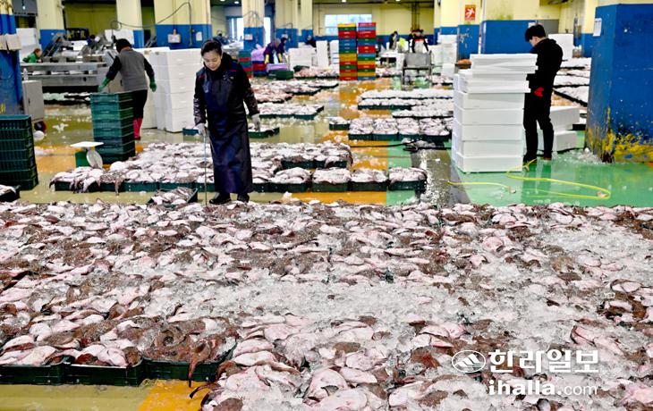 17일 제주시 한림읍 한림수협 어판장이 이른 아침 경매를 마친 수산물 선별 작업으로 바쁘게 돌아가고 있다. 강희만기자