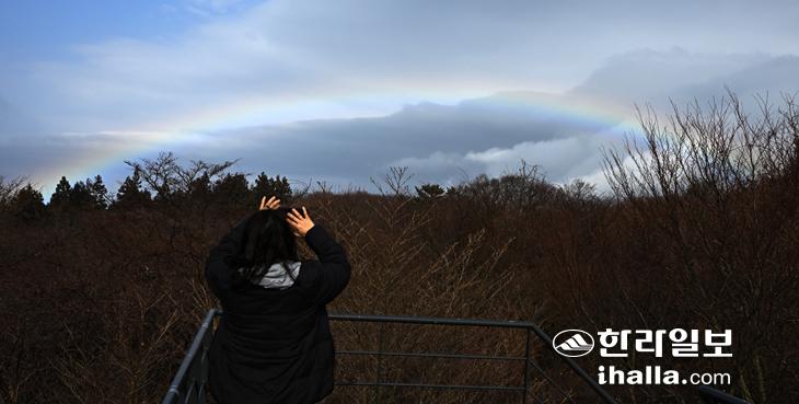 18일 오전 한라산 어리목 인근에 무지개가 나타나자 한 행인이 사진을 찍고 있다. 강희만기자
