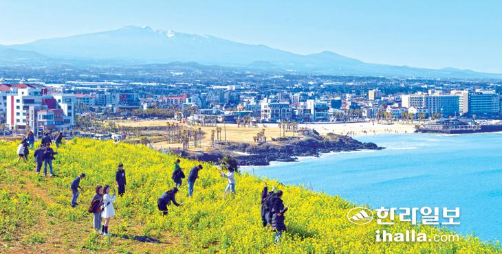 17일 제주시 함덕서우봉을 찾은 관광객들이 노란 유채꽃과 함덕해수욕장을 배경으로 기념사진을 찍고 있다. 이상국기자