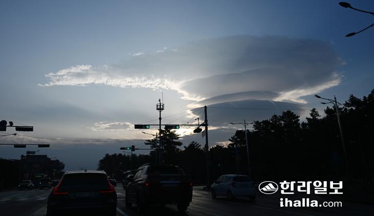 19일 제주시 상공에 '렌즈구름'이 떠올라 신비한 분위기를 자아내고 있다. 강희만기자