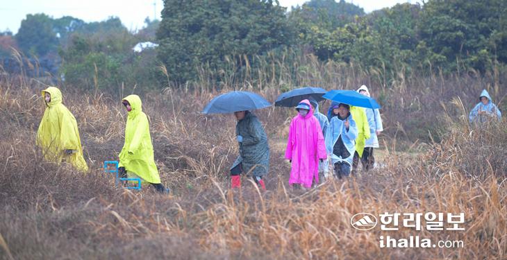 20일 제주시 구좌읍 한동리를 찾은 관광객들이 비옷을 입은 채 올레길을 걷고 있다. 이상국기자