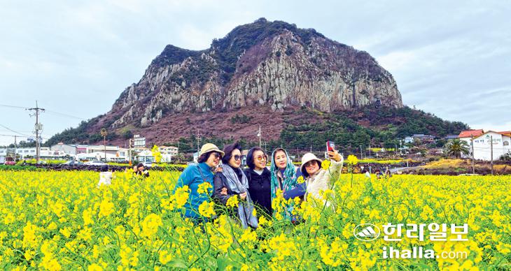 21일 서귀포시 안덕면 유채꽃밭을 찾은 관광객들이 산방산을 배경으로 기념사진을 찍고 있다. 이상국기자
