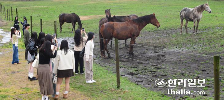 21일 제주시 한림읍 성이시돌목장을 찾은 관광객들이 말을 구경하고 있다. 이상국기자