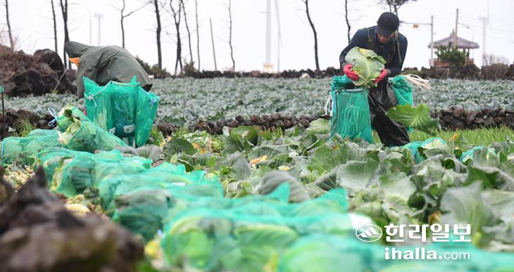 21일 제주시 한림읍 한 밭에서 농민들이 양배추를 수확하고 있다. 이상국기자
