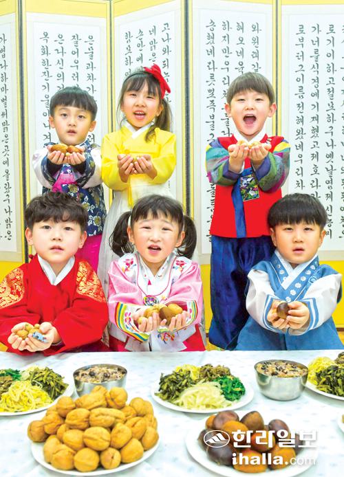 정월대보름을 이틀 앞둔 22일 제주시 이도2동 키즈빌 어린이집에서 어린이들이 부럼깨기를 하고 있다. 이상국기자