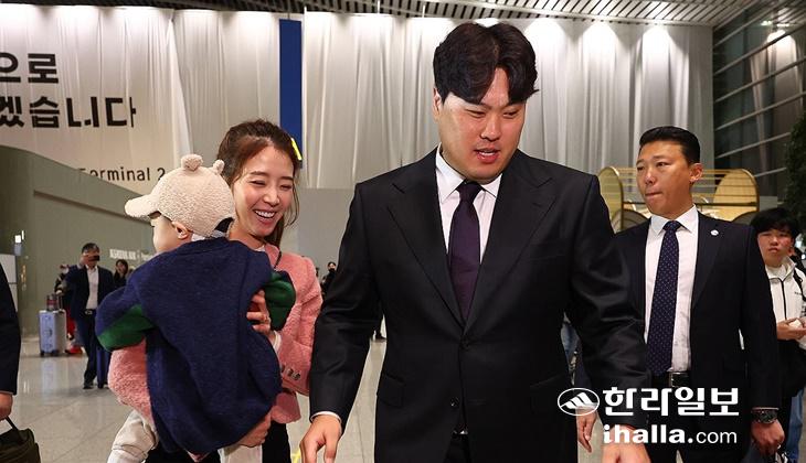 한화 이글스와 계약하며 12년만에 한국프로야구 KBO리그로 돌아오는 류현진이 23일 오전 인천국제공항 제2여객터미널에서 한화 2차 캠프 합류를 위해 출국하며 가족들에게 인사하고 있다. 연합뉴스
