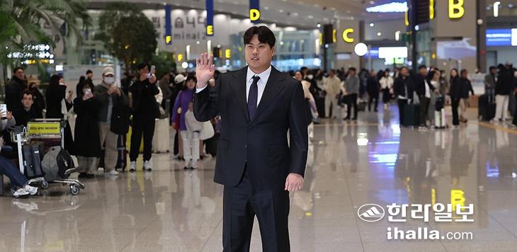 한화 이글스와 계약하며 12년만에 한국프로야구 KBO리그로 돌아오는 류현진이 23일 오전 인천국제공항 제2여객터미널에서 한화 2차 캠프 합류를 위해 출국하며 손을 흔들고 있다. 연합뉴스