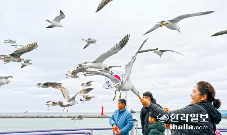 지난 24일 서귀포시 성산읍 성산포항에서 우도로 출발하는 도항선에서 관광객들이 괭이갈매기에게 과자를 주고 있다. 강희만기자