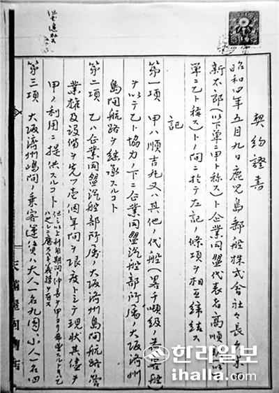 기업동맹 기선부가 가고시마우선주식회사와 체결한 업무위탁 계약서(1929년 5월 9일)