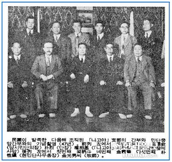 1947년 민단 발족 때 중앙간부 기념사진 속 고순흠(앞줄 좌측 두 번째). 1972년 6월 29일자 동아일보