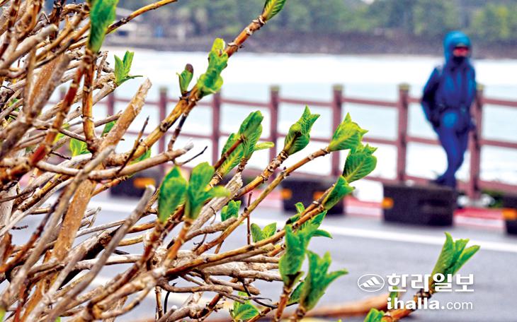 26일 제주시 구좌읍 하도리 해안도로변에 수국 잎사귀가 돋아나 봄소식을 전해주고 있다. 강희만기자