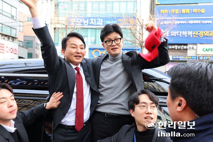 국민의힘 한동훈 비상대책위원장이 23일 오후 인천 계양구 계양산전통시장을 방문해 계양을 원희룡 후보와 함께 시민들에게 인사하고 있다. 연합뉴스