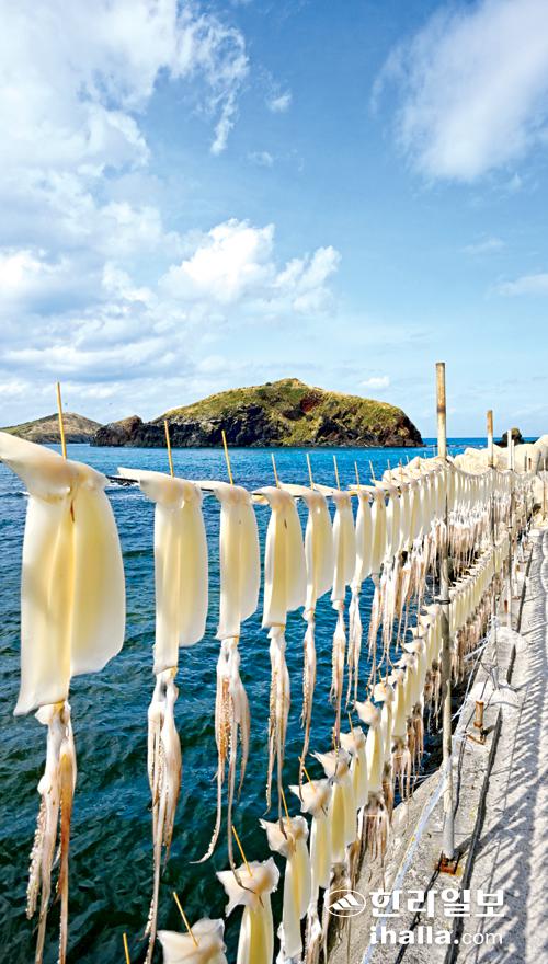 28일 차귀도가 바라보이는 제주시 한경면 고산포구에서 오징어 말리기 작업이 이뤄지고 있다. 강희만기자
