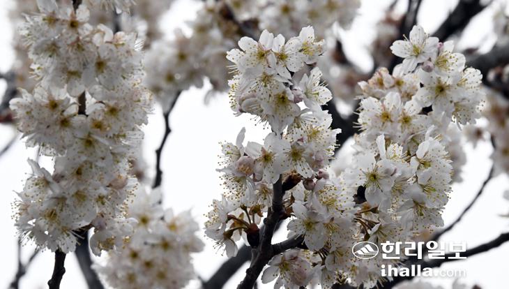 2월의 끝자락인 28일 제주시 이호동의 한 주택에 양벚꽃이 만개해 시선을 사로잡고 있다. 강희만기자