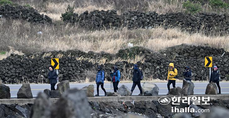6일 제주시 조천읍 조천해안도로에 올래꾼들이 제주의 밭담을 배경으로 걸어가고 있다. 강희만기자