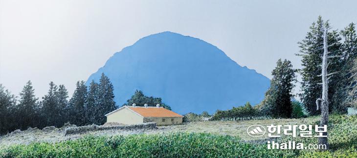 지경이 어디인지 알 수 있는 풍경을 그리려 마을 곳곳을 누비고 다니다가 발견한 너무도 아름답고 조화로운 지점에 이르렀다. 멀리 산방산이 보인다. 그것도 중턱 정도의 눈높이가 소실점이다. 그러므로 여기는 해발 고도가 얼마나 되는지 가늠이 된다. 산이 시각적 척도로 작용하는 상황이다. 오후의 햇살을 담채화 느낌으로 연필선이 드러나게 그렸다. 전형적인 제주의 밭이다. 밀감나무가 근경 아래를 쟁반처럼 받아주고 있고 그 위에 놓여있는 풍경들이 정겨움을 더한다. 밭 가운데 무덤이 있고 그 옆에 농업용 창고로 보이는 집이 있다. 나무들이 서있는 위치와 구도가 참으로 경이로운 짜임새를 연출하고 있다. 왼쪽 햇살 아래 나무들은 역광에 가깝고 오른쪽으로 올수록 명암이 뚜렷하게 나타나는 파노라마다. 오른쪽 앞에 죽은 지 오래된 소나무가 껍질이 벗겨져 흰 속살을 드러내고 있는 처량함이 화면 전체에 끼치는 영향이 크다. 어떤 서정성을 대변이라도 하는 것처럼 그림자를 드리우고 아직도 쓰러지지 아니하고 자신의 존재를 알리고 있다. 밭 가운데 무덤이 주는 이 섬의 독특한 풍광은 오랜 세월 이 밭들과 함께 살았던 어느 시기의 삶이 고전처럼 읽힌다. 멀리 산방산의 엷은 파란색이 거리감으로 작용하여 화면 전체의 공간감을 증폭시키는 역할을 하고 있다. 눈부신 어느 봄날, 뽀얀 대기에 쌓인 다사로움이 느껴지도록 그리려 하였다. 짙은 곳과 희미한 곳의 대비가 주는 탄력적 리듬감. 평범한 것들이 모여 특별해지는 경우다.