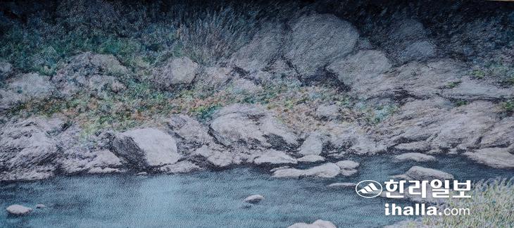 세월이란 무엇인지 그리고 싶었다. 저 바위들이 절벽에서 일시에 떨어져 나와 뒹구는 것은 아니리라. 어느 것은 천 년 전에, 또 어떤 것은 오백 년 전에, 오른쪽 끝에 있는 덩치가 큰 놈은 60년 전에 절벽에서 떨어져 나와 풍경의 일부가 되었을 것이다. 계곡 양안으로 원시림처럼 상록수들이 우거져 있는 상황에서 빛은 오묘한 변화를 보여준다. 숲의 그림자가 지는 곳은 절벽에 가까운 곳이며 물이 고여 있는 하천의 중심 지역은 햇살의 영향을 많이 받게 된다. 마치 연극무대의 조명처럼 원근감을 만들어내게 되는 것이다. 그러한 빛의 변화를 주제로 나타내고자 하였다. 맑은 물 속에 보이는 바위들의 희미한 느낌을 수채화라고 하는 장르로 나타내는 것은 어려운 시험을 보는 수험생과 같은 심정이다. 현무암 지대가 대부분인 섬 제주에서 조면암 지대 계곡을 만나기는 쉽지 않다. 바위들의 특징이 더욱 견고한 강도를 지니고 있으면서 햇살을 받으면 더 밝게 보이는 차이점을 끄집어내려 하였다. 뒤에 풀에 가려지면서도 깊이감과 무게감을 동시에 지니고 있는 큰 바위에서부터 물 위에 빙산처럼 일부분이 튀어나와 밝게 빛나는 돌에 이르기까지 중간에 흙들이며 봄내음 나는 풀들이 하모니를 이루면서 조화롭게 정물화처럼 자리를 잡고 있는 물상들이다. 물과 돌과 풀이 이토록 화목하게 살아갈 수 있는 것은 계곡이라는 울타리 속에서 너무도 오랜 기간을 함께 살아온 가족이라서 그럴 것이다. 사물들이 모여서 노래하는 빛의 합창을 그렸다, 바람소리와 함께.