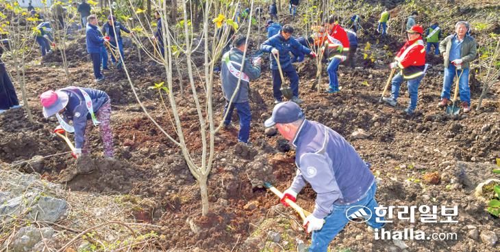 7일 서귀포시 안덕면 상창리 한 야산서 열린 '새봄의 시작을 알리는 나무 심기'에서 참가자들이 황칠나무를 식재하고 있다. 서귀포시가 마련한 이날 행사는 올해 전국에서 가장 먼저 열린 나무 심기 행사다. 이상국기자