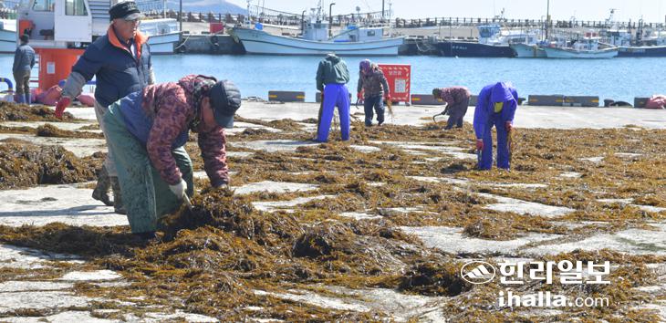 지난 9일 제주시 구좌읍 종달리에서 어민들이 모자반 말리기 작업을 하고 있다. 이상국기자