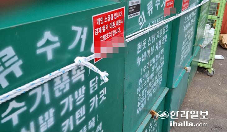 11일 제주시내 한 클린하우스. 클린하우스 바로 옆에 의류수거함 3개가 밧줄로 서로 꽁꽁 묶인채 나란히 놓여 있다. 또 이 수거함에는 '개인 소유물입니다. 강제 철거, 이동, 훼손시 고발 조치 합니다'라는 빨간색 경고 스티커가 붙어 있다. 경고 스티커가 붙은 수거함 양 옆으로는 비슷한 모양의 의류 수거함 2개가 또 놓여있었다.