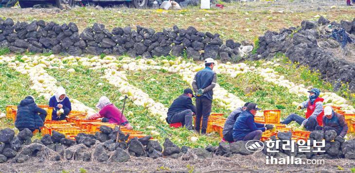 제주시 구좌읍 하도리의 한 밭에서 농민들이 막바지 월동무 수확 작업에 분주한 모습이다. 강희만기자
