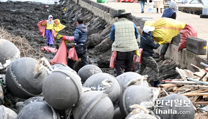 12일 제주시 애월읍 해안에서 바다환경지킴이들이 해양쓰레기 수거 작업을 하고 있다. 강희만기자