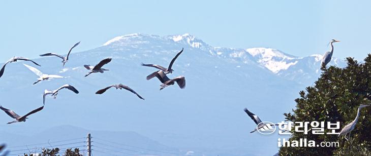 13일 제주시 구좌읍 동복리에서 번식지로 이동중인 왜가리와 중대백로 무리가 만설인 한라산을 배경으로 날아가고 있다. 강희만기자
