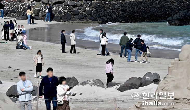 13일 제주시 함덕해수욕장을 찾은 관광객들이 가벼운 옷차림으로 제주의 봄 바다를 즐기고 있다. 강희만기자