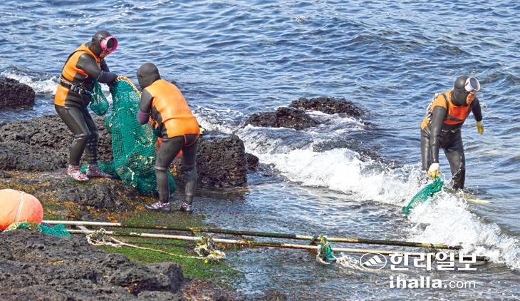 14일 제주시 한림읍 수원리 앞바다에서 해녀들이 물질작업을 끝내고 뭍으로 나오고 있다. 강희만기자