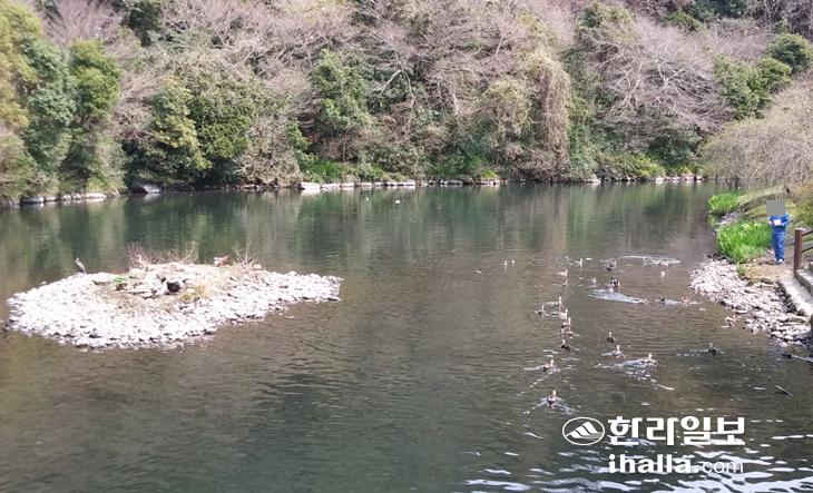 지난 17일 천지연폭포 매표소 앞 물가. 몇몇 방문객들이 물 위를 헤엄치고 있는 새들을 향해 사료 등 먹이를 던지고 있었다. 비둘기들도 그 주변에 모여들었다.