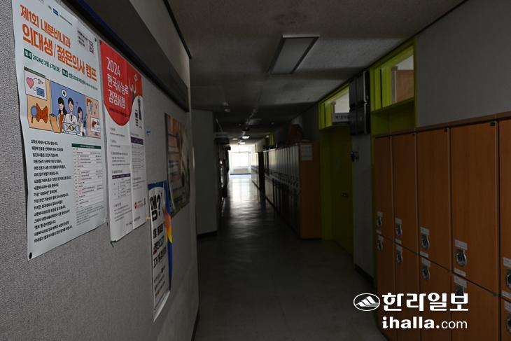 제주대학교 의과대학 개강 첫 날인 18일 의대 강의실 대부분이 불이 꺼진 채 문이 잠겨있다. 강희만기자