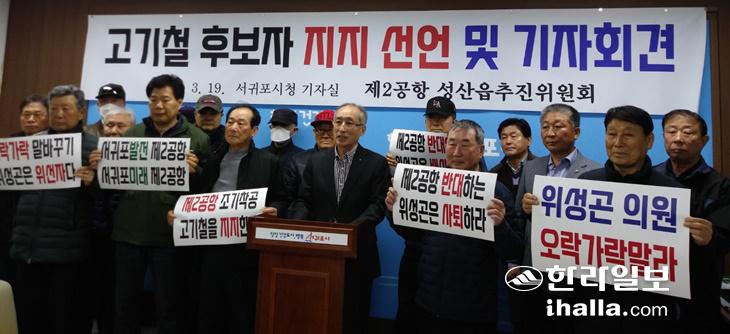 제주 제2공항 성산읍 추진위원회가 19일 서귀포시청 기자실에서 고기철 예비후보 지지 선언을 위한 기자회견을 하고 있다. 진선희기자