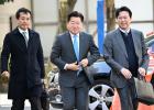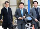 오영훈 제주지사(사진 가운데)가 20일 공직선거법 위반과 정치자금법 위반 혐의 사건의 항소심 첫 공판에 출석하기 위해 변호인들과 함께 법원에 들어서고 있다. 강희만 기자