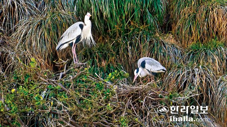 20일 제주시 화북동 별도봉 절벽에서 왜가리 한쌍이 둥지를 만들고 있다. 왜가리는 우리나라 곳곳에서 번식을 하지만 제주에선 최근들어 극소수의 개체만 발견되고 있다. 강희만기자