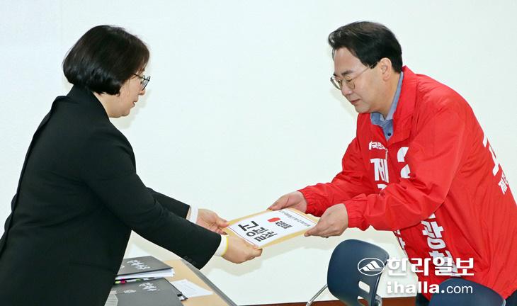 21일 선거관리위원회를 찾아 후보 등록하는 제주시갑 국힘 고광철 후보. 고광철후보선거사무소 제공