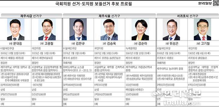 제주시갑 선거구에는 더불어민주당 문대림 후보(이하 기호순)와 국민의힘 고광철 후보가 등록했다. 제주시을 선거구에는 더불어민주당 김한규 후보와 국민의힘 김승욱 후보, 녹색정의당 강순아 후보가 등록해 완주에 나선다. 서귀포시 선거구에는 더불어민주당 위성곤 후보와 국민의힘 고기철 후보가 맞대결한다. 당초 무소속 임형문 예비후보가 나섰으나 최종 후보 등록을 포기했다. 이에 도내 여러 언론사 등의 여론조사에서 가장 치열한 경쟁을 보이고 있는 해당 선거구의 선거 결과에 관심이 집중되고 있다.