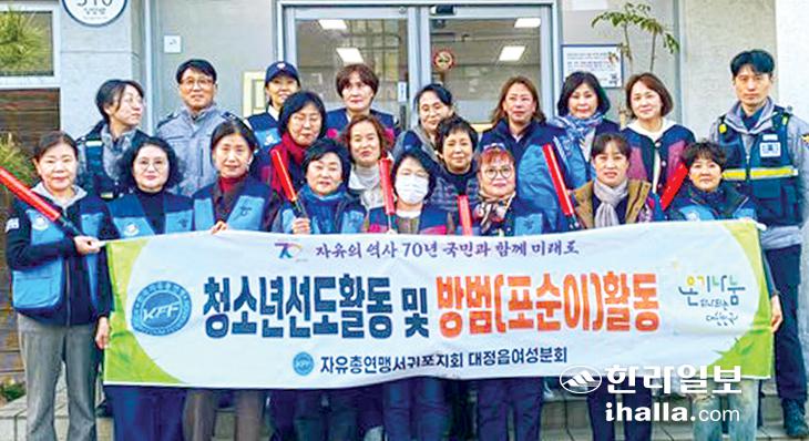 자유총연맹서귀포지회 대정읍여성분회(회장 신성자)는 지난 20일 서귀포경찰서 대정파출소(소장 송병모)에서 야간 방범(포순이) 발대식을 열고 합동으로 취약지 방범 순찰을 실시했다.