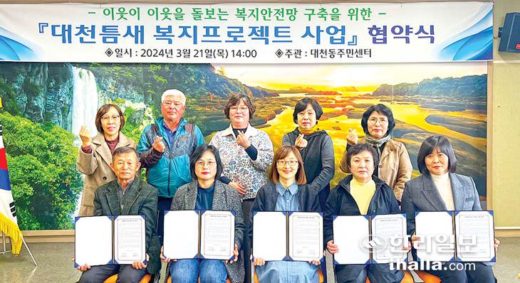 서귀포시 대천동주민센터(동장 고상희)는 지난 21일 대천동주민센터 회의실에서 지역사회보장협의체 임원진과 식당·약국·편의점 등 협약기관 3곳의 관계자가 참석한 가운데 이웃이 이웃을 돌보는 복지 안전망 구축을 위한 '대천틈새 복지프로젝트' 업무 협약식을 개최했다.